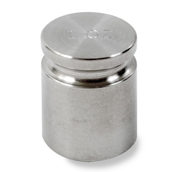 Stainless steel test weights ≥1g, ≥0.01lb, are cylindrical and ≤500mg, ≤0.005lb, are flat. Cube weights range from 100g-1kg, 2oz-2lb.